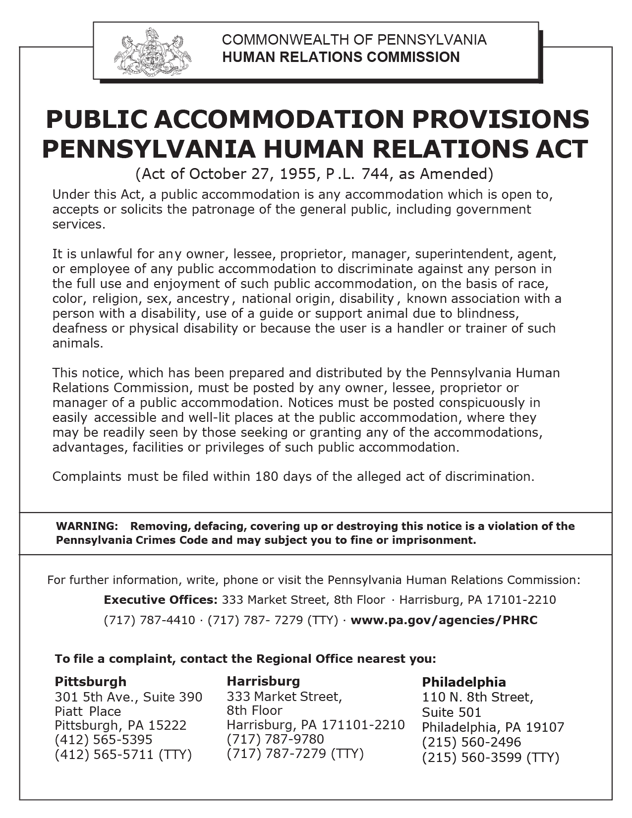 Pennsylvania Public Accommodation Provisions Poster