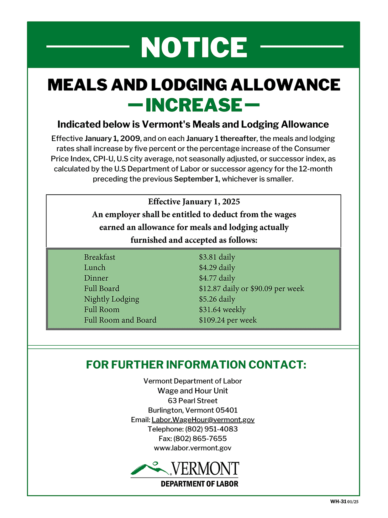Vermont Meals and Lodging Allowance Poster
