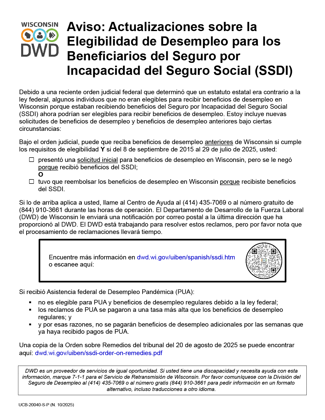 Wisconsin Unemployment Eligibility for Social Security Disability Insurance (SSDI) Recipients (espaƱol)